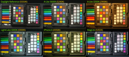 So with the manual white balance we can see that the overall results are pretty good. By comparison to the iPhone which shows some pretty awful tint issues but these little cubes hold their own very well. Certainly good enough to use in mixed lighting setups without fear. Note that the WB was set to 6000, so lights at lower temperatures would be noticeably warmer, as expected. I threw in a LedLenser torch as well, out of curiosity and was quite surprised at how good the results from that were as well. So don’t dismiss some of these modern LED torches - they focus as well.