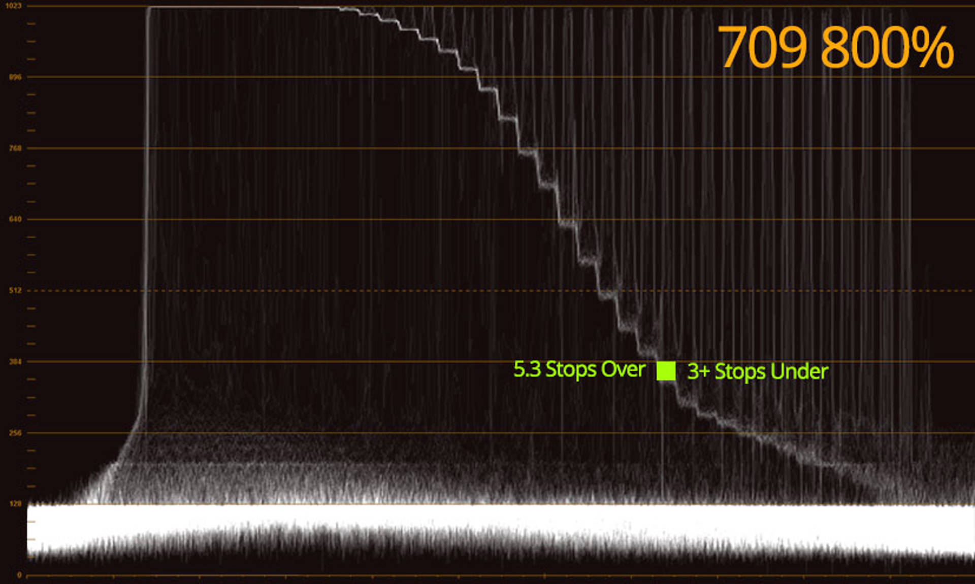 The above diagram shows from the brightest down, the green vertical lines mark stops, so there are at least 10 stops of real range in there, then it gets mushy. There's probably another stop in there for a total of 11 stops. The blacks of the SLog curve seem quite elevated (they don't reach zero, black never seems to get to black) and the Black Level profile setting has no effect. This seems a shame because we're losing vital range within our 8 bit container. But, as we'll come to later, the Black Gamma does have an effect and this can be quite important.